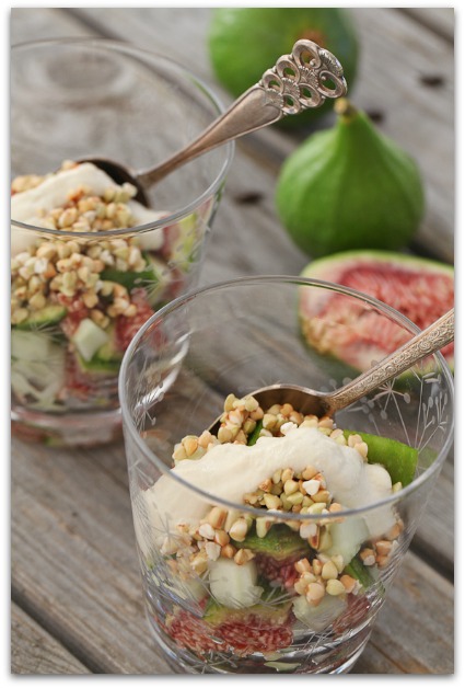 Place diced figs and cucumbers into each serving dish, top with buckwheat and drizzle generously with creme.