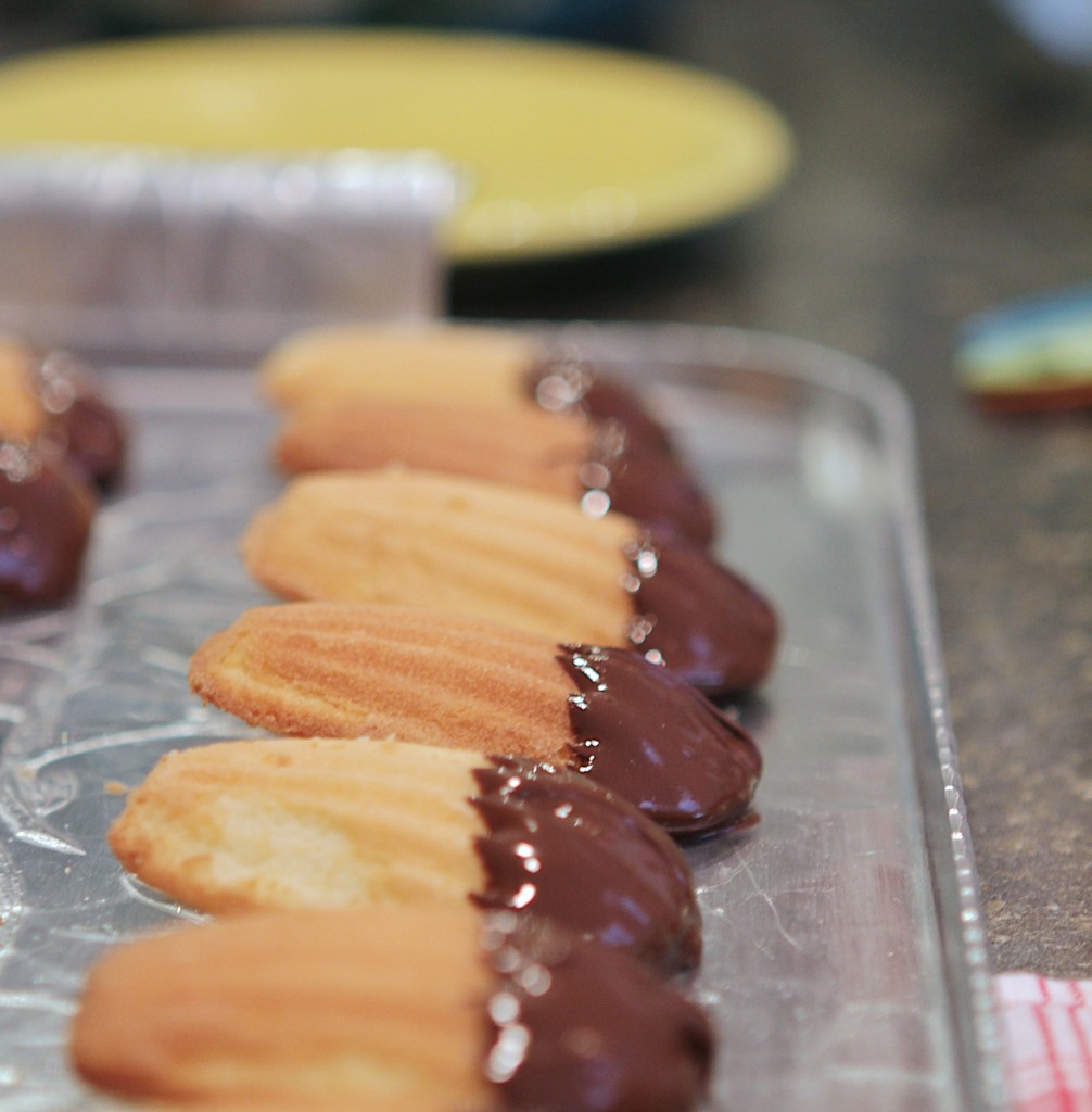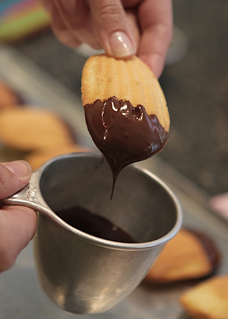 - Dip each madeline into the melted chocolate, coating bottom third part of the cookie. Shake off excess chocolate and place on baking sheet lined with wax paper. Repeat for all the cookies and leave at room temperature for 1 hour or until chocolate is set.