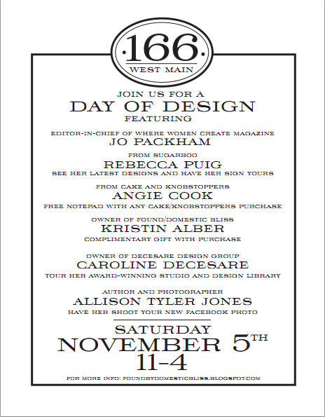 “We are proud to be a part of the November issue of Where Women Create magazine. This issue will feature our store as well as the ever talented Alison Tyler Jones and Caroline DeCesare. We would love for you to join us for an open house and party to celebrate! Alison & Decesare Design Group will open up their creative spaces for tours… they are full of inspiration!