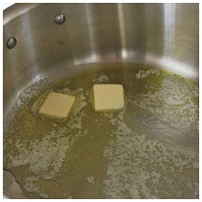 - In 8 quart pan, on medium to high heat, melt butter to foam and add olive oil.