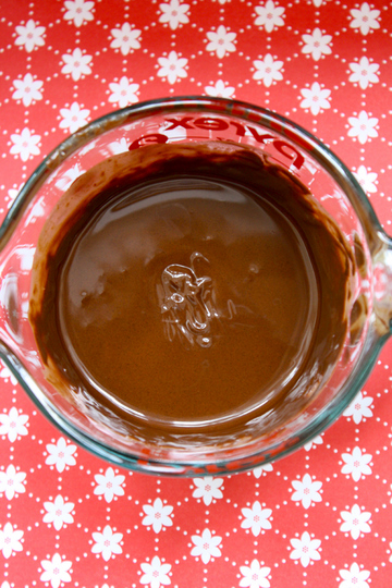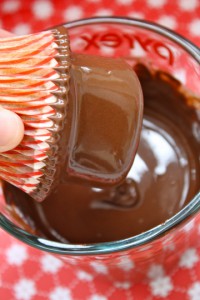 *Add chocolate chips and vegetable oil to a deep dish (I like to use a measuring cup) and cook at 30 second intervals (stirring after each interval) until chocolate is melted. Stir until completed combined. *This chocolate cupcake topping recipe and dipping technique is from Bakerella. (Bakerella.com)