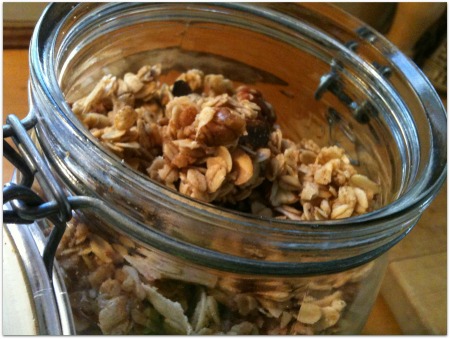 Use this recipe as a template and add your favorite dried fruit, nuts and seeds. And be sure to allow the granola to sit and set after baking to insure you get lots of satisfying yummy chunks! So that I’m not tempted to sneak a taste before it’s set, I make my granola at night, turn off the oven before I go to bed and let it sit and set overnight in the oven. You can be guaranteed we’re all eating granola the following morning!