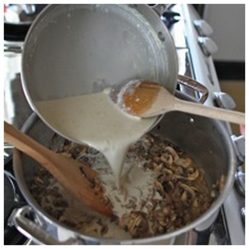 - And turn on medium to low heat. Heat this to dissolve the granules. Make sure you do not boil the cream. While this is heating, you may begin with the mushrooms.