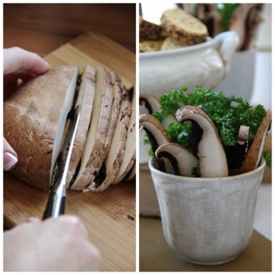 - Reduce heat to low and keep warm while preparing the table and slicing the portobello mushrooms.
