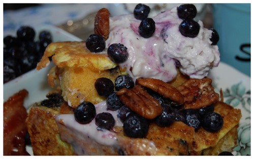 As the granddaughter of a homesteader I realize cooks in many countries use the same method for reviving day old bread: Dip it in eggs and cream or milk then panfry. My blueberry muffin french toast is a descendant of pain perdu (literally “lost bread) I learned to waste not. A farm wife’s philosophy born out of necessity.