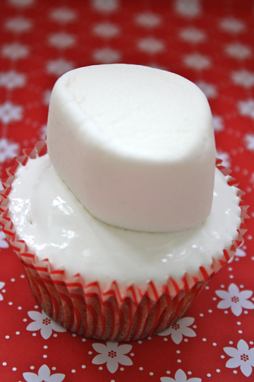 Add marshmallows to the tops of the fluff-covered cakes.