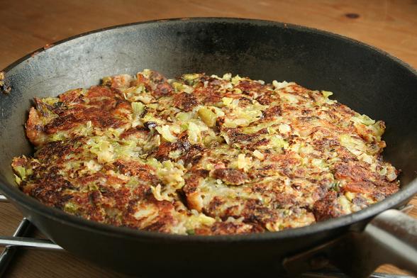 - Press mixture lightly onto the surface of the skillet to form a large pancake.
