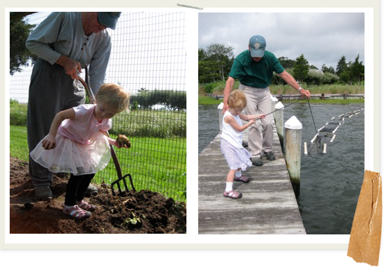 The first is that nothing beats local and, when possible, homegrown. My passion about this goes way back. Here’s a shot of me digging potatoes for dinner when we visited friends on Shelter Island, NY, a couple of years ago (another philosophy I embraced early on: A pink tutu is suitable for almost any task). And there’s me on the same trip, helping pull in the oysters being cultivated just offshore.